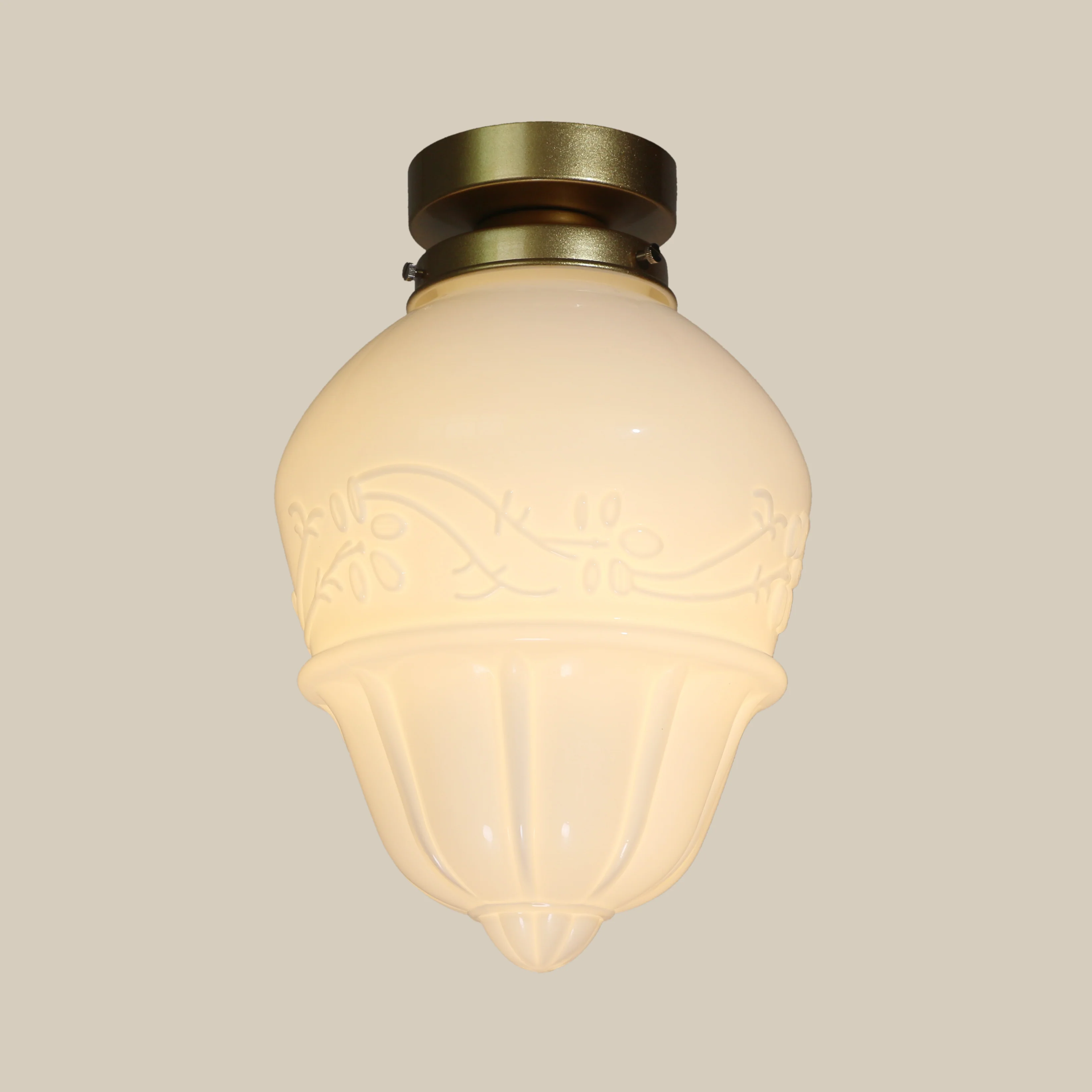Milky white frosted glass shade. Option of brass or black metal fittings. |