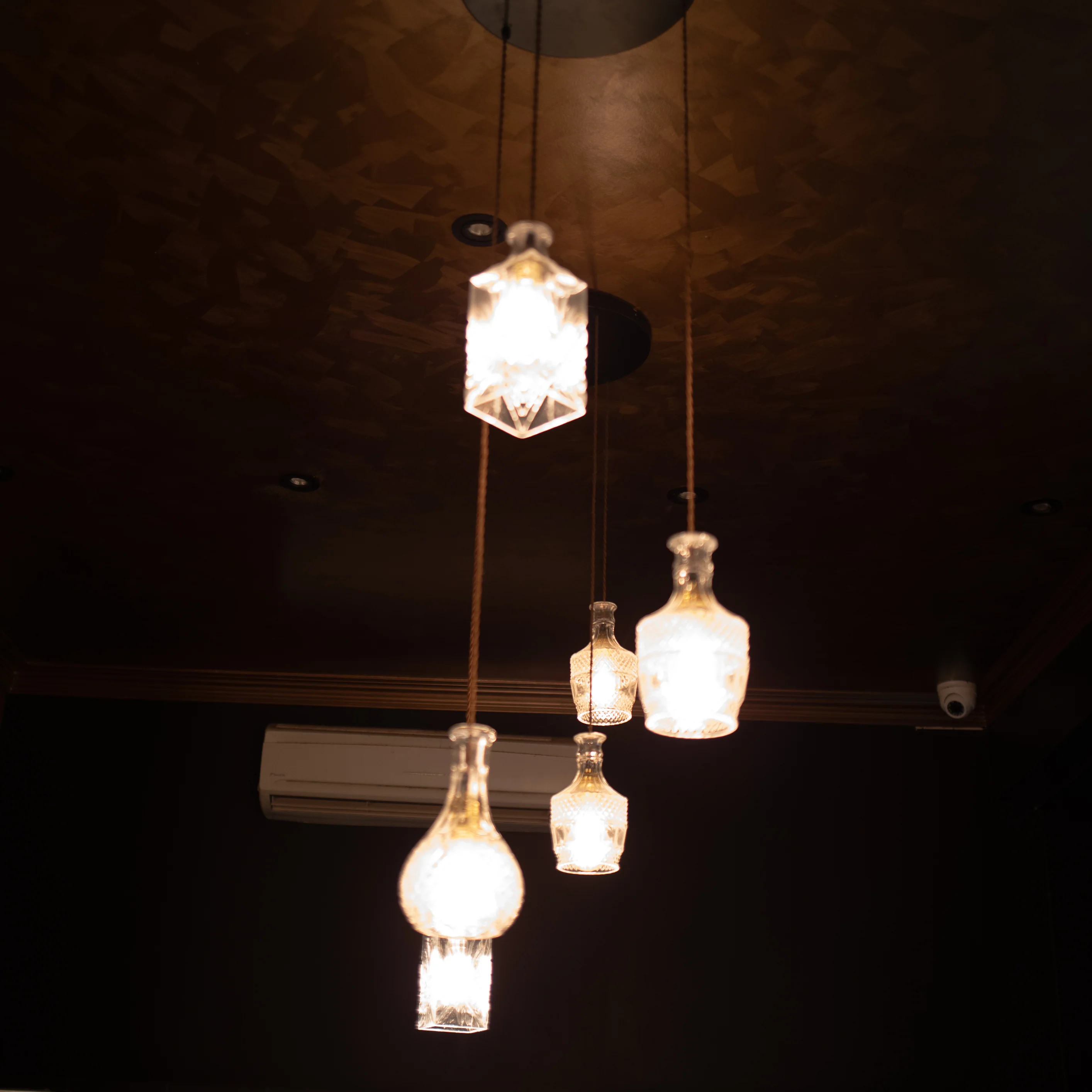 The bottle light Chandelier is a stunning lighting centrepiece featuring one Square, one Bell and one Tulip Decanter lights hung at various lengths to create a luxurious installation of clear, hand cut, crystal shades. Can be arranged as cluster pendant light chandelier