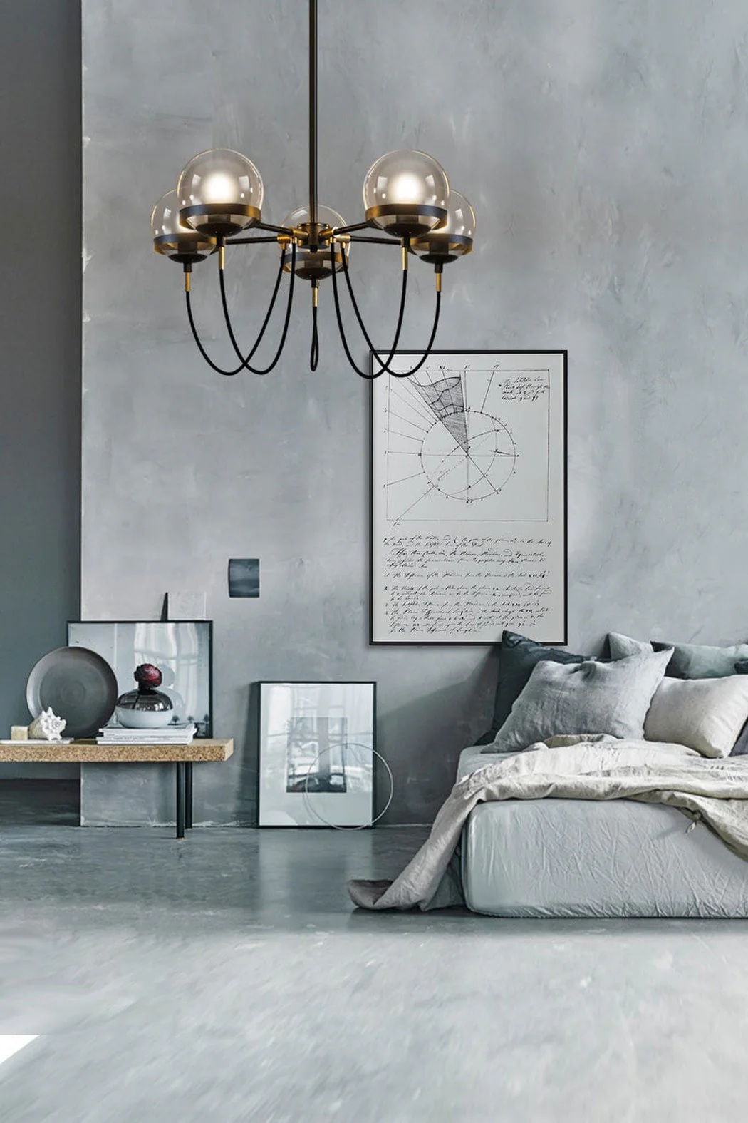 This chandelier features a unique arrangements of finely blown glass nestled in a premium set of brushed metal rings. The design alludes a minimalist art deco elegance that is sure to be a outstanding statement piece in your space.