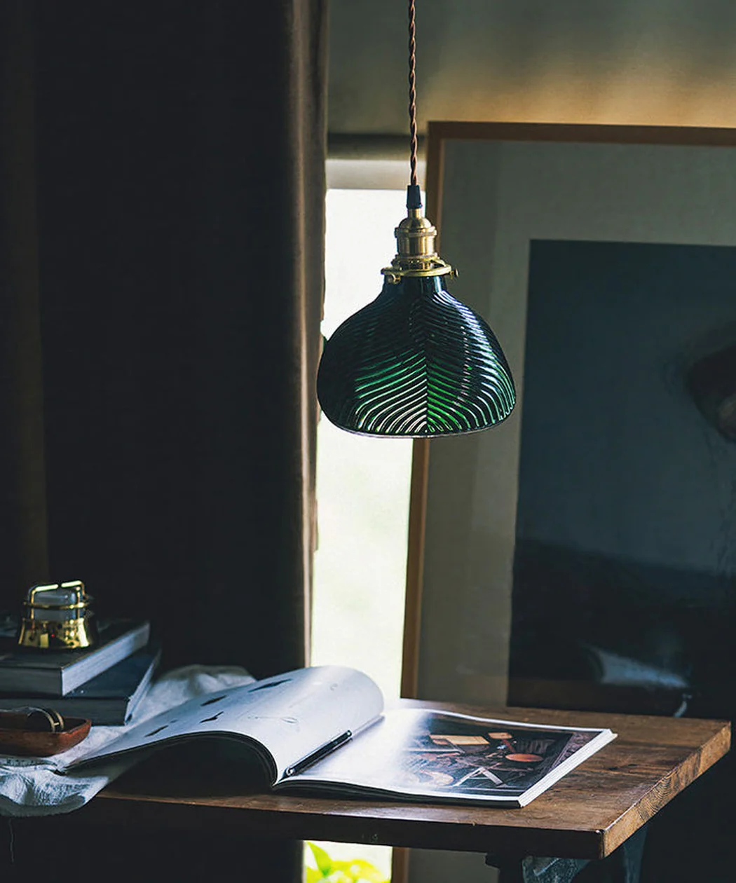 Emerald Green Fluted Shell Glass Art Deco Pendant Light