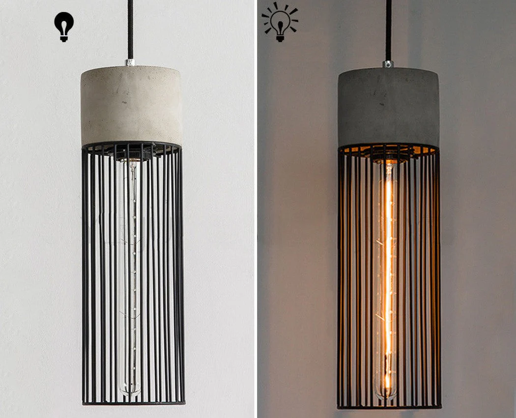 Minimalist pendant light combining concrete cement and steel cage. This industrial-inspired pendant light is the ideal complement to instantly add character to your space.Â