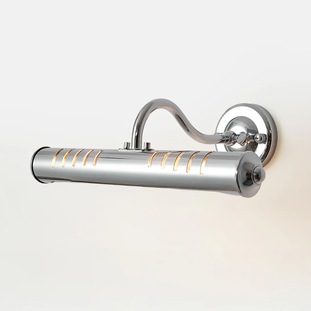 Sterling is a sleek retro classic wall light available in chrome and brass. Perfect as a bathroom vanity light, it adds a polished glow above mirrors. Its directional design makes it ideal for cafes and restaurants to highlight menu boards or artwork. Sterling also works beautifully as a bedside or hallway picture light, bringing timeless elegance to any space.